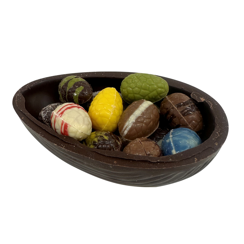 eierschaal groot melk/puur/wit. gevuld met 15 eitjes. Graag de chocoladekeuze (melk, puur of wit) vermelden bij uw bestelling in het opmerkingenvlak.